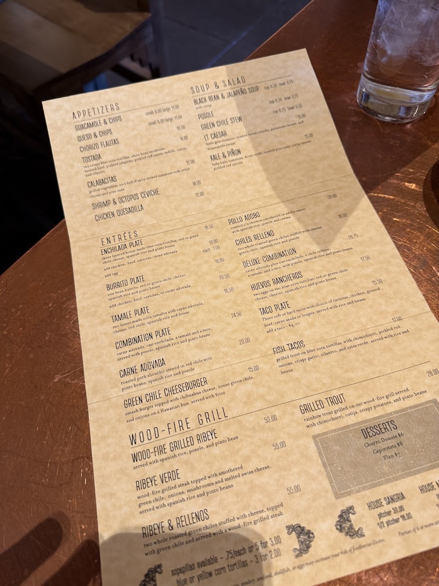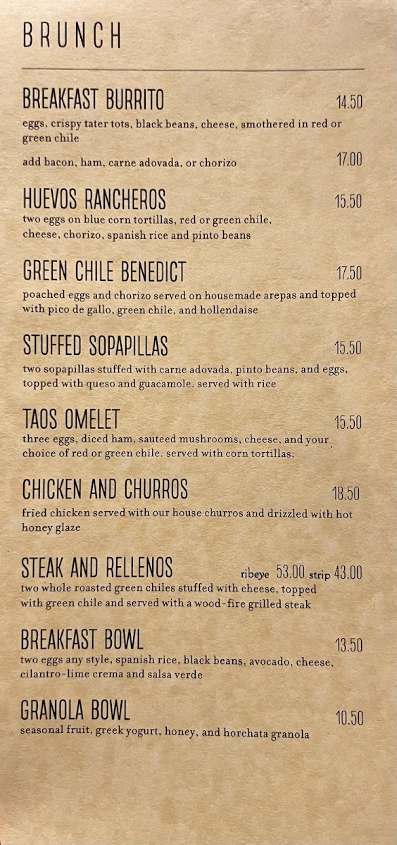 Two whole roasted green chiles stuffed with cheese topped with green chile and served with a wood fire grilled ribeye